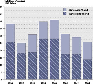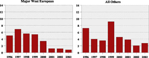 Der var ingen fredsdividende i årene mellem Golfkrigen og Irakkrigen, men afsætningskriser i våbenindustrien. Dette fremgår tydeligt af udviklingen i den amerikanske våbenindustris fortjenester frem til irakkrigens start. USA's våbenindustri havde siden 1990 mistet meget store markedsandele både på hjemmemarkedet og i EU, specielt efter indførelsen af det indre marked.