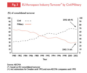 Den europæiske rumindustris samlede omsætning er årligt på 5,5 mia. euro. 'I de senere år stammer halvdelen af den europæiske rumindustris samlede omsætning fra institutionelle ordrer, den anden halvdel fra det kommercielle marked. Det står i modsætning til, hvad der er tilfældet i USA, hvor tre fjerdedele af omsætningen stammer fra ordrer fra NASA og forsvarsministeriet. Inden for de offentlige udgifter er forholdet mellem civile og forsvarsrelaterede udgifter 1:5 i Europa, mens det i USA er 1:1', forklarer EU-kommissionen i, Europæisk rumpolitik, fra januar 2003. Året efter fastslår kommissionen i Grønbogen, at af 'Medlemsstaternes forsvarsudgifter går en femtedel til indkøb af militært materiel (indkøb samt forskning og udvikling)'.