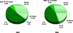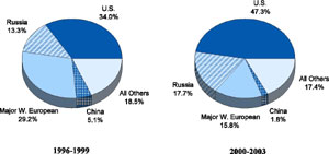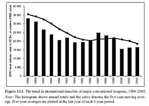 Sovjetunionen og Warshawapagtens sammenbrud medførte to ting: 1) en fredsdividende bestående af begrænsede nedjusteringer af forsvarsudgifter i USA og i Europa (bortset fra Danmark og Norge), og dermed mindre våbensalg og 2) en stor amerikansk dominans på det militære område som aktuelt forstærkes af et enormt militært pengeforbrug samt ved forskning og udvikling af nye våben og doktriner til at anvende disse våben med; et våbenkapløb i USA kaldet genopbygning af USA's forsvar [sic] af tænketanken, the Project for the New American Century.